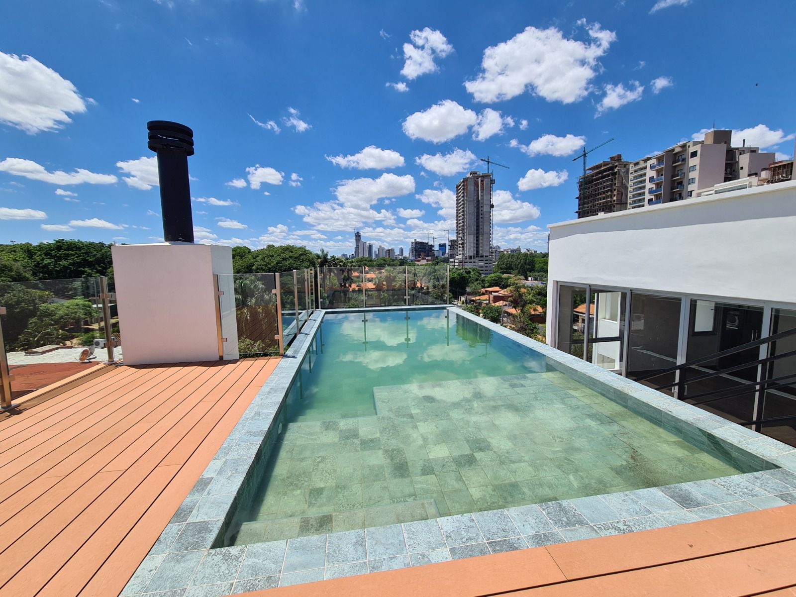Piso 5°: Terraza con quincho techado totalmente equipado, un deck elevado para solarium y piscina con vistas a la ciudad.